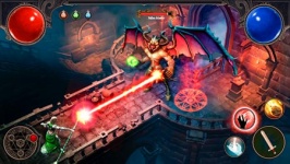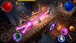 There is no possibility of character selection and customization here, your path starts immediately in one of the dungeons. In just a few steps you will be shown how to fight and kill evil spirits. Which is pretty simple... at first. Bring the hero to the skeleton and he will automatically start hitting him with a sword. If you want to strike with a spell, press the corresponding button at the bottom right. Joystick movement from the bottom left is a mobile role-playing game control classic.